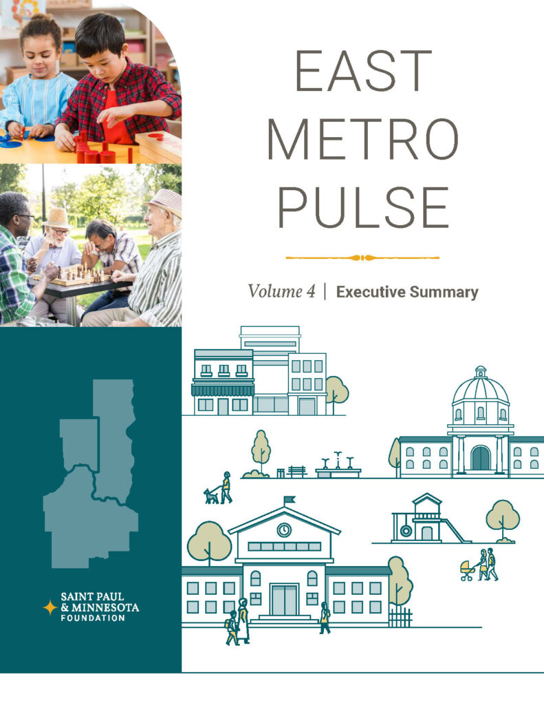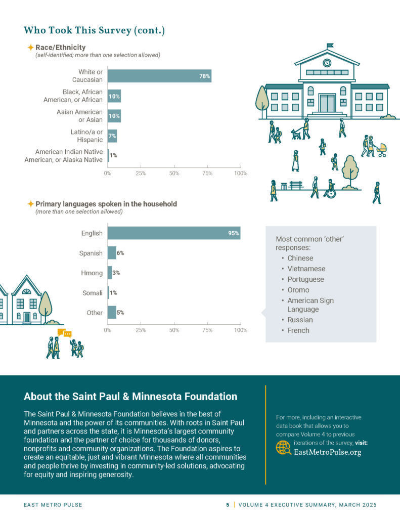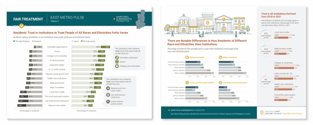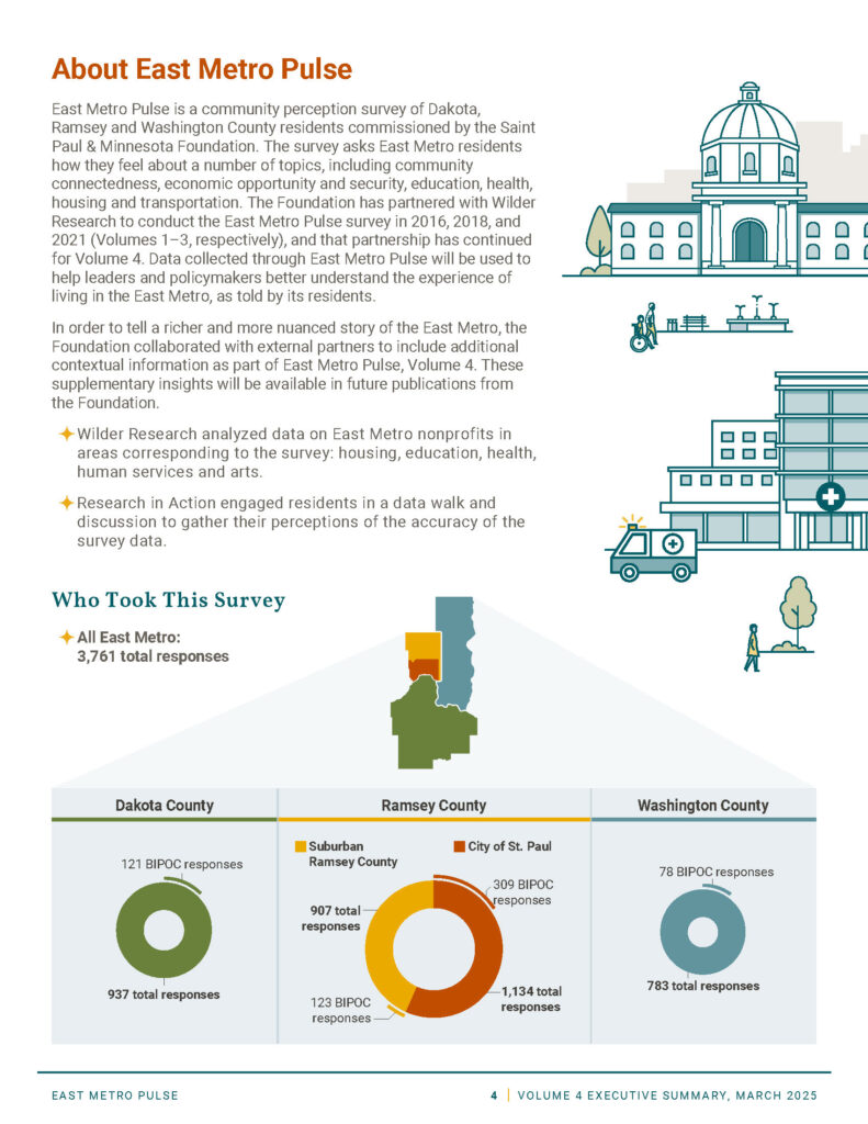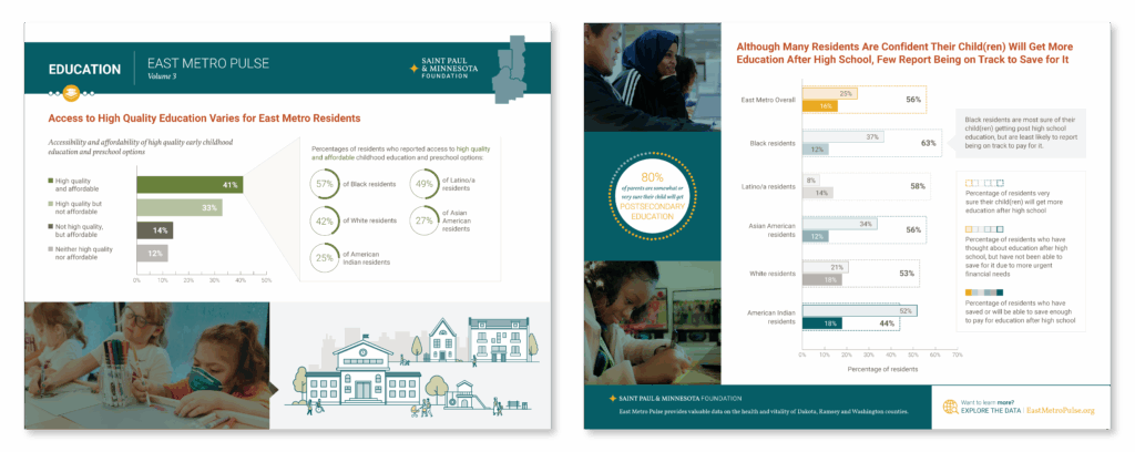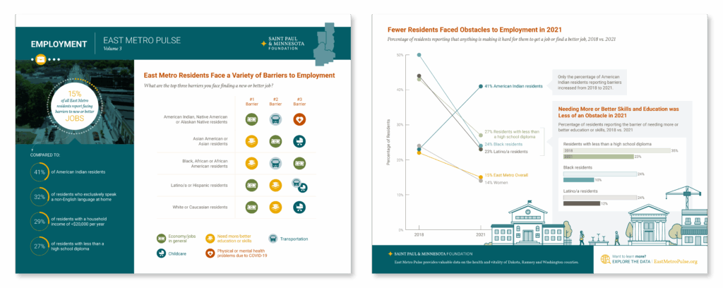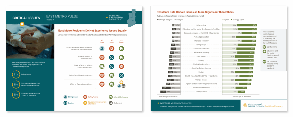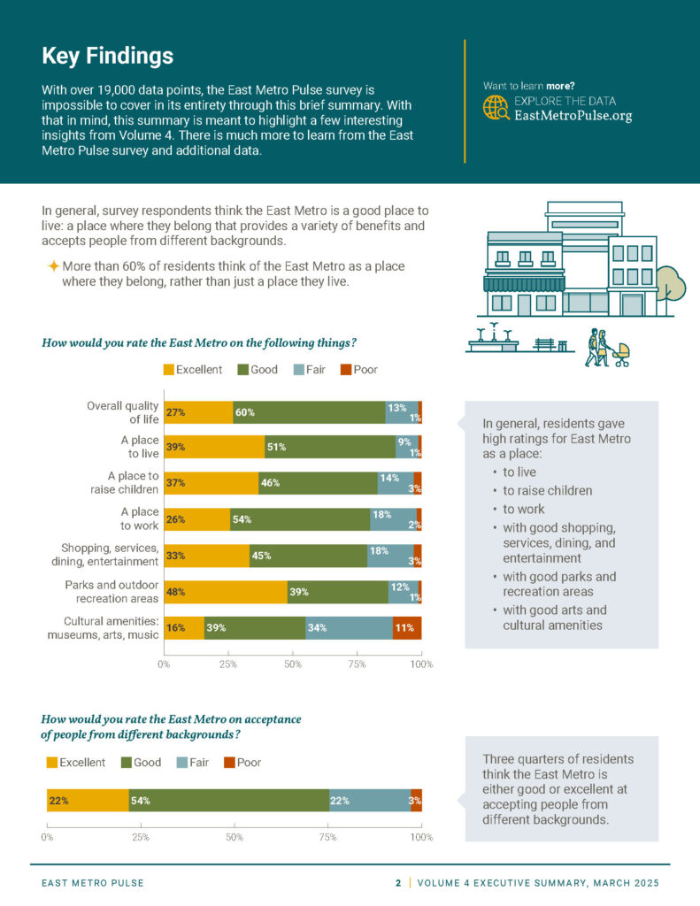 For volume 3 of the East Metro Pulse, we designed a suite of mini-reports that highlight key findings from the survey, pairing data visualization with clear narratives. Each report reveals insights about community vitality, equity, and quality of life across the East Metro region.