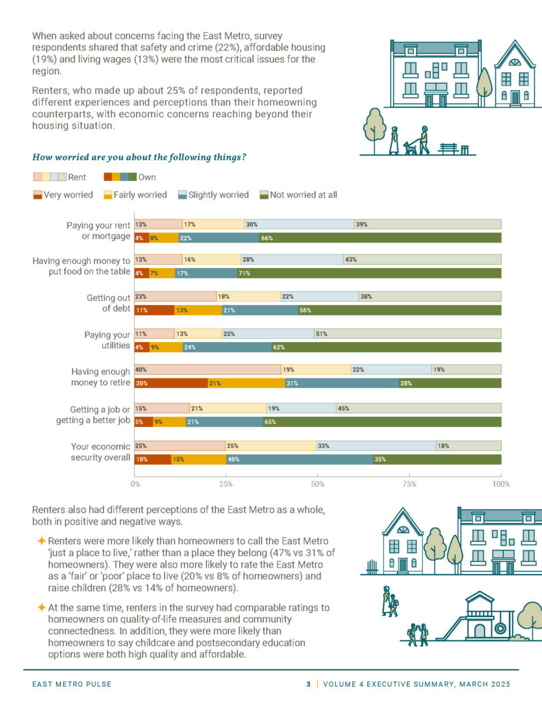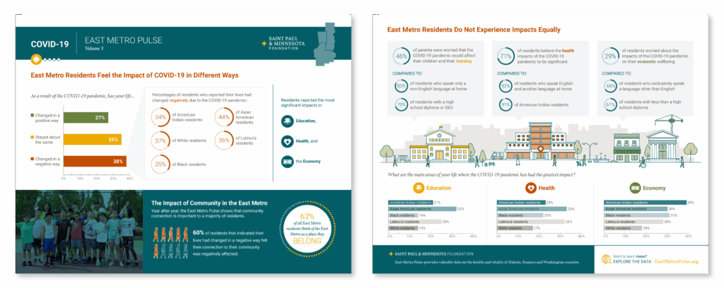 Illustration-rich infographics turn East Metro Pulse survey data into stories of community insight.