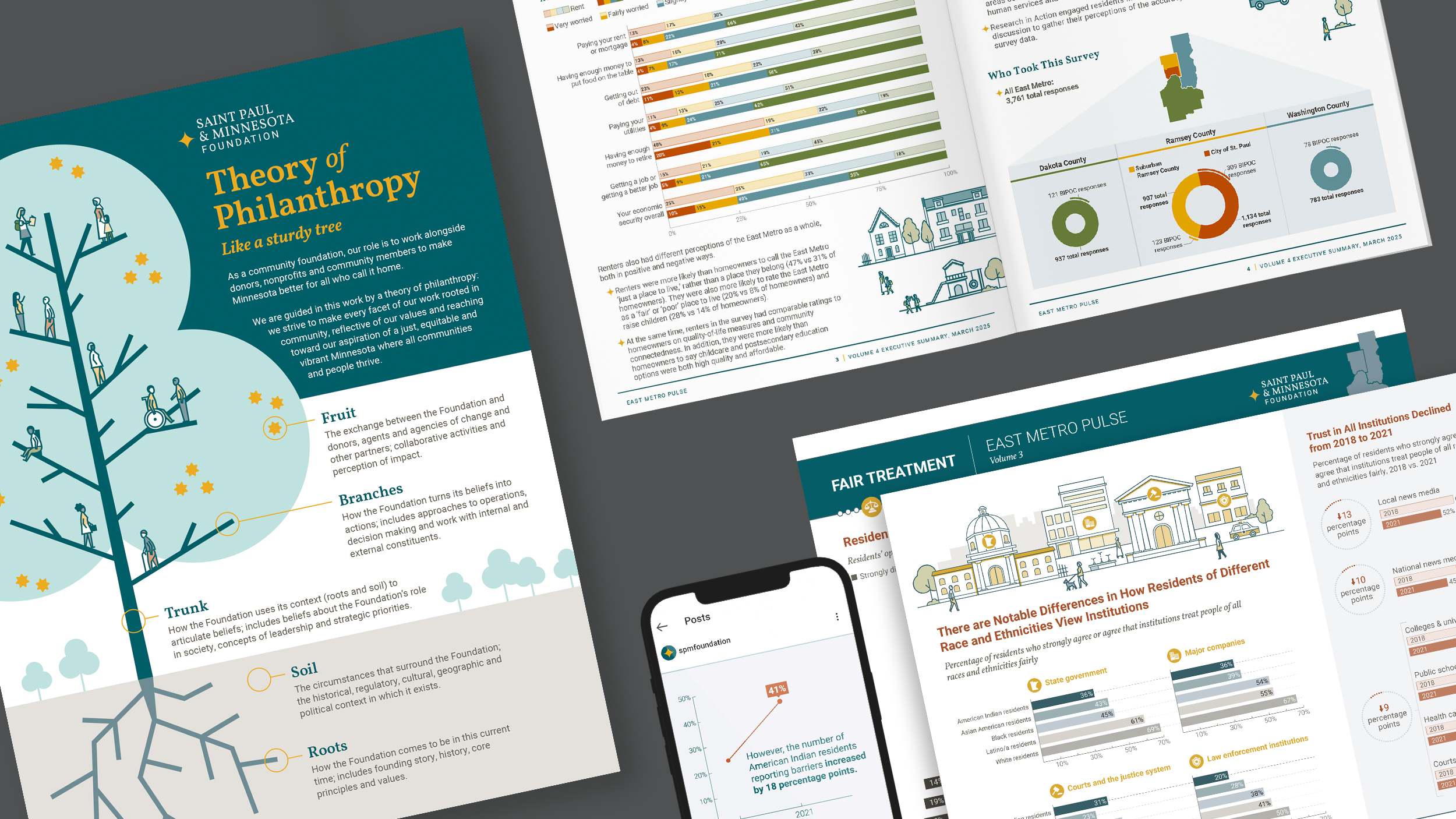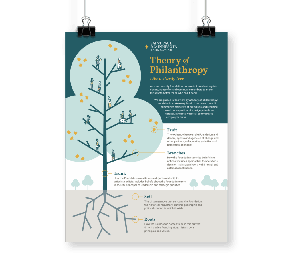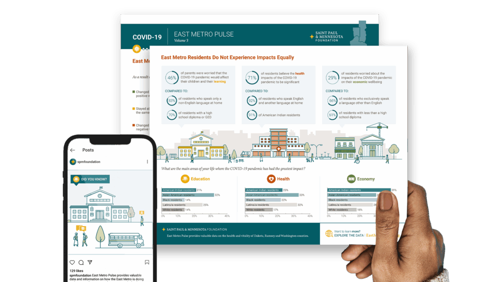 In partnership with the Saint Paul & Minnesota Foundation (SPMCF), we’ve designed tools that translate complex data and mission-driven strategy into engaging visual stories. From research reports that measure community vitality to a visual framework that expresses SPMCF’s philanthropic values, each piece helps audiences connect to SPMCF’s work toward an equitable, just, and vibrant Minnesota.